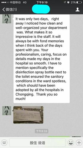 熊女士是一名企业高管,其爱人是荷兰人。住院期间,舒适温馨的就医体验令二人印象深刻。为表达由衷的感谢之情,二人特意编辑一则如上的微信内容,不仅感谢眼科谢主任精湛的医术,让她重新清晰的欣赏这个美好的世界;也对医院注重细节的管理,尤其对眼科病房马桶坐垫圈消毒方案给与了特别认可。