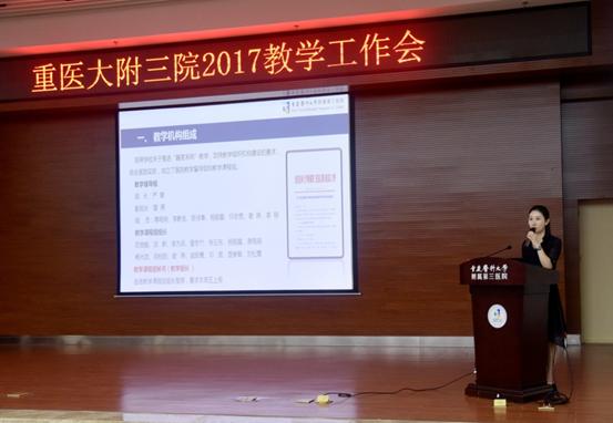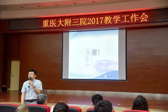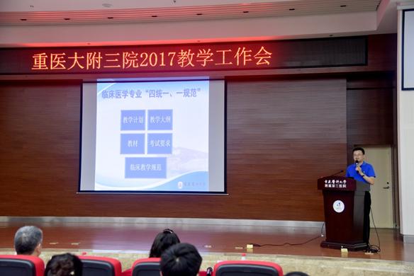 2017-06-23 00:00 6月20日下午,“重医大附三院2017年教学工作会”在学术报告厅隆重召开。本次会议由党委副书记、副院长曾燕主持,特邀重庆医科大学副校长邓世雄、教务处副处长李兵出席并作专题培训,院常务副院长严敏、人力资源部赵臻晶科长、教学督导组成员、教学课程组组长及全院300余名带教教师参会。