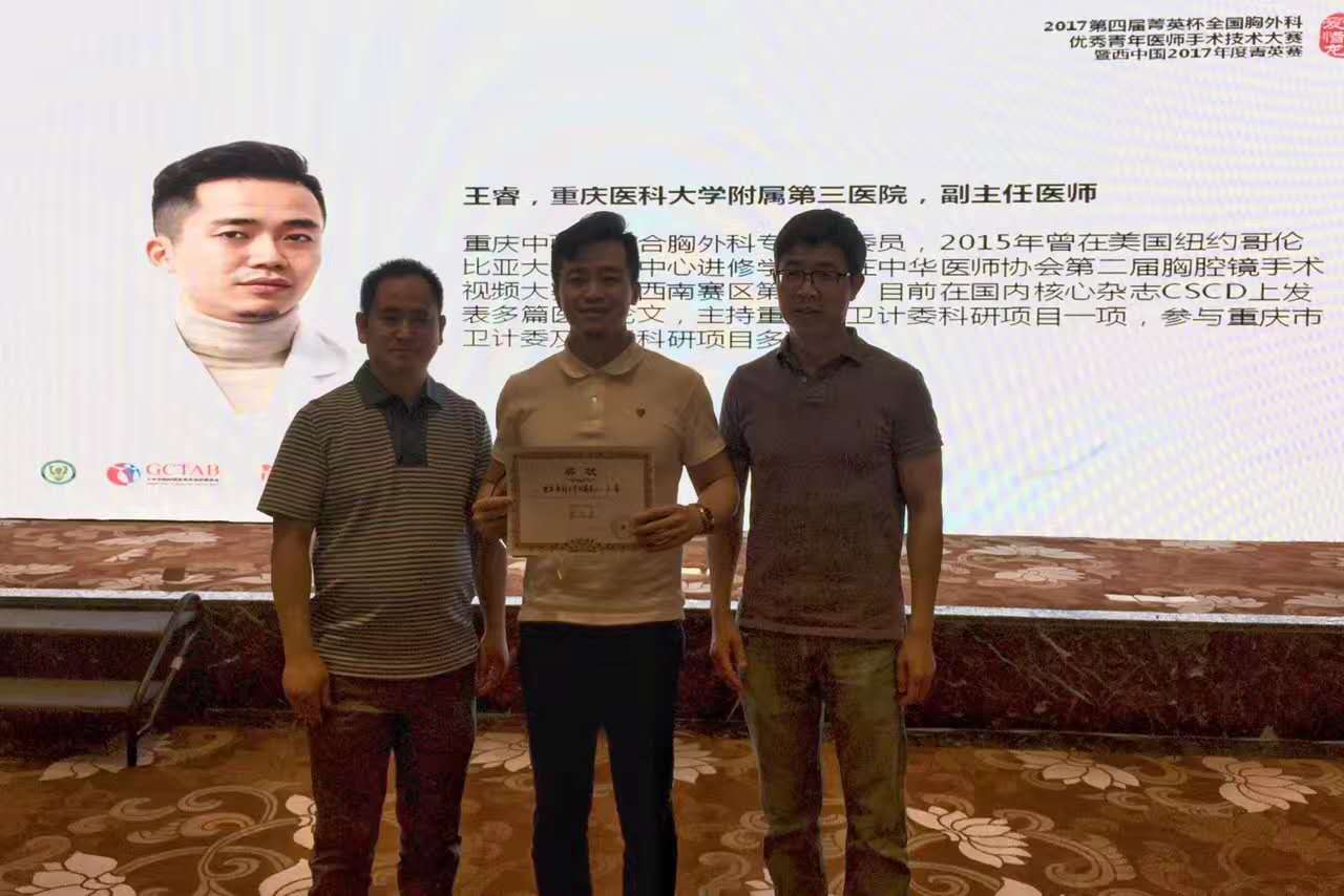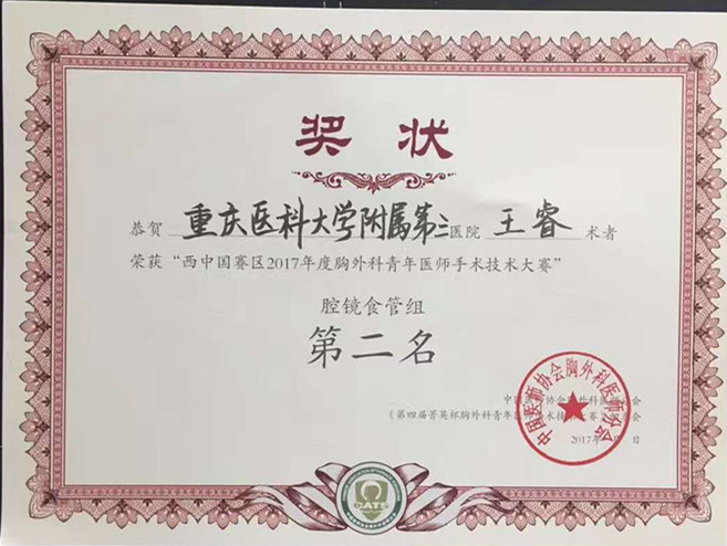 我院呼吸疾病中心王睿副教授喜获“西中国赛区2017年度胸外科青年医师手术技术大赛”腔镜食管组第二名