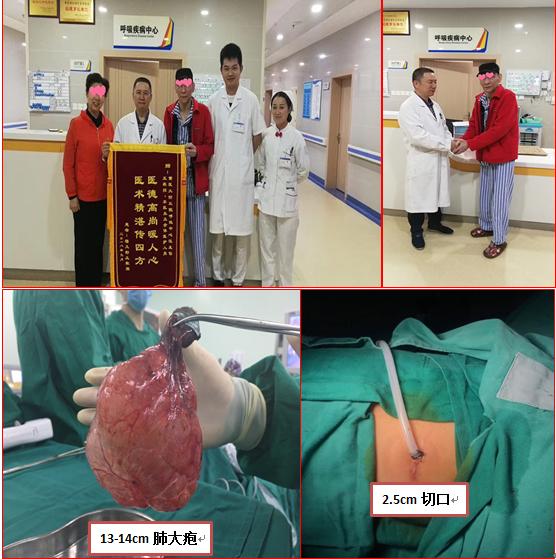 患者入院后,诊断为双肺多发肺大疱、慢性阻塞性肺病、重度营养不良等。经中心制评估,患者体重仅39kg,BMI指数13.19,双肺多发肺大疱,最大的约13~14cm,全身状况极差,无法耐受手术。但患者强烈坚持手术,经临床营养科、麻醉科、呼吸疾病中心、康复医学科会诊评估,制订了术前营养支持及肺康复锻炼方案。经过两周左右的营养支持后,患者体重由入院时39KG增至42KG,增加了手术耐受力。 8月15日,患者在全麻下行单孔胸腔镜下右肺肺减容术,手术切口仅2.5cm。手术过程充满了风险,但由于术前准备充分,术后经过精心治疗,患者最终顺利度过危险期。