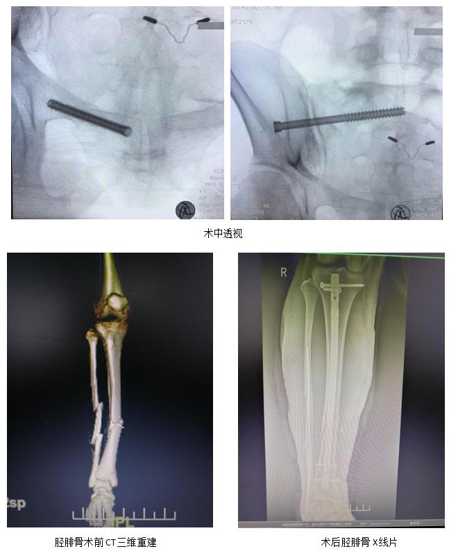 随着麻醉的起效,患者全身多处骨折闭合复位内固定手术顺利进展,凭着扎实的临床经验,主刀医生郑明顺利置入骨盆后侧的骶髂螺钉及前侧的耻骨支通道螺钉。在助手牵拉、旋转、复位的密切配合下,精准的将患者的多段腓骨粉碎性骨折闭合复位成功!接下来的胫骨髓内钉闭合复位内固定也成功开展。