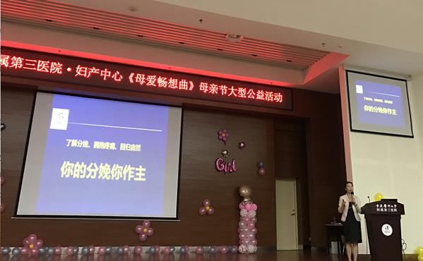 随后,重庆医科大学音乐治疗师范尧副教授向与会人员分享了《音乐分娩》的专题讲座,范教授结合音乐分娩临床案例,从音乐分娩的意义、学习内容、学习方法等方面为准妈妈做了系统的阐述,引起现场准妈妈们的强烈反响。