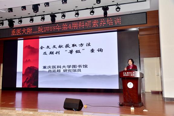 2018-12-06 00:00 12月5日下午5:30,我院顺利举办了“2018年第4期科研素养培训”,特邀重庆医科大学图书馆肖廷超研究馆员开讲《外文全文文献获取方法与技巧》,本次会议由院党委副书记、副院长曾燕教授主持,全院约300名员工参会。