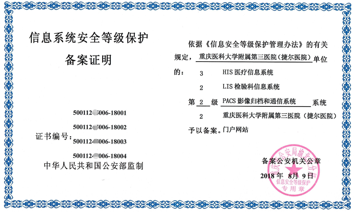 为有效保障我院医疗业务稳定运转,切实提高医院信息系统安全水准,我院2018年初启动医院信息系统等级保护整改、测评工作。8月份完成定级、备案;依照安全规范,9月、10月从安全技术和安全管理两个维度进行安全建设和整改;10月22日顺利通过信息安全等级测评(HIS系统3级、LIS/PACS/官网2级)。