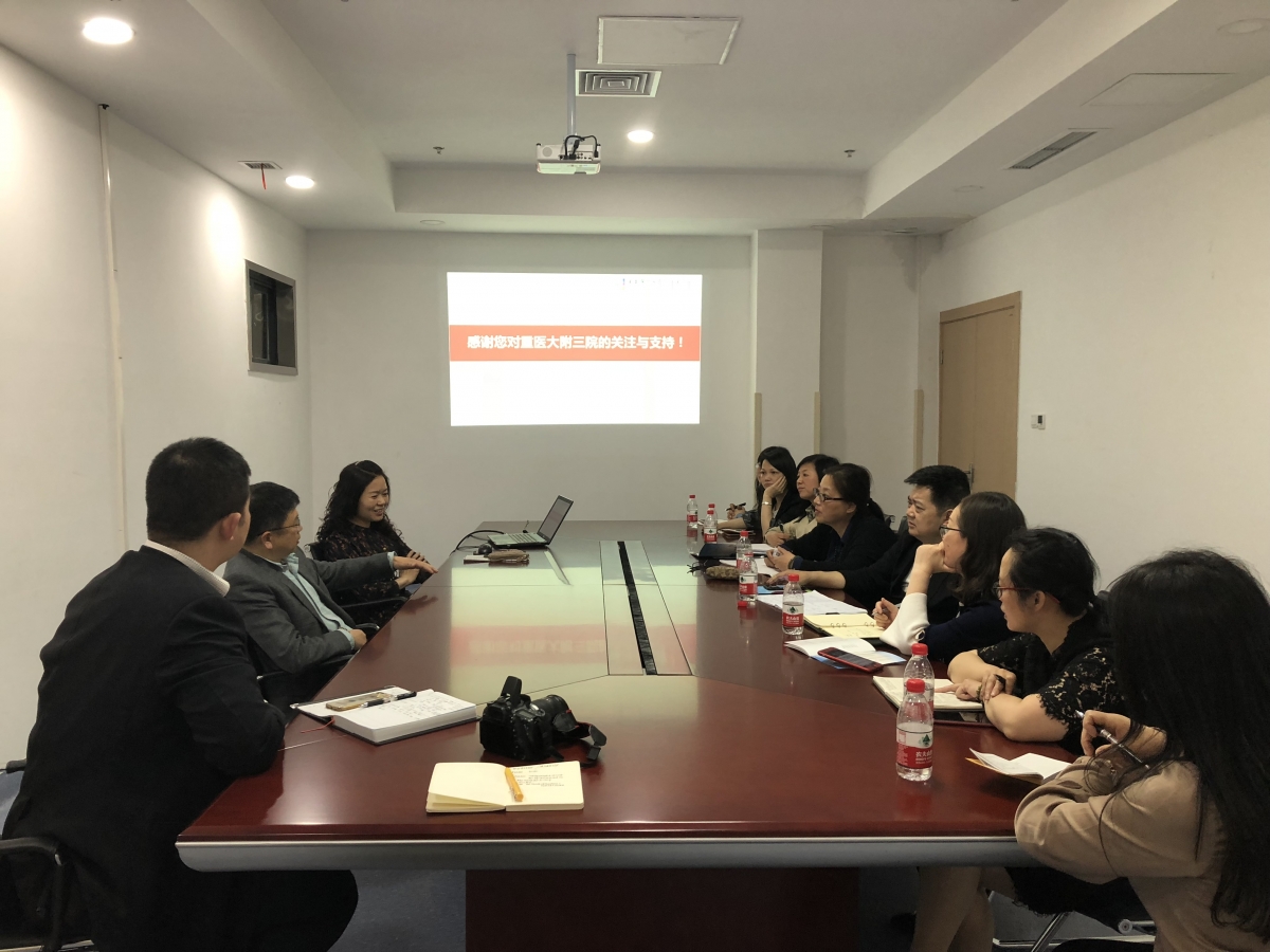 2018-04-10 00:00 2018年4月8日下午,成飞医院院长刘作林、党委书记罗洪萍及航空工业成飞(集团)公司发展部主任杨萍一行8人到我院考察交流,重医大附三院常务副院长严敏,党委副书记、副院长曾燕及党政办副主任裴仲琦热情接待了来宾并进行座谈。