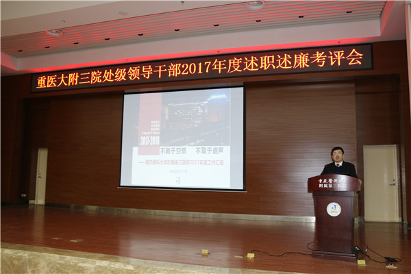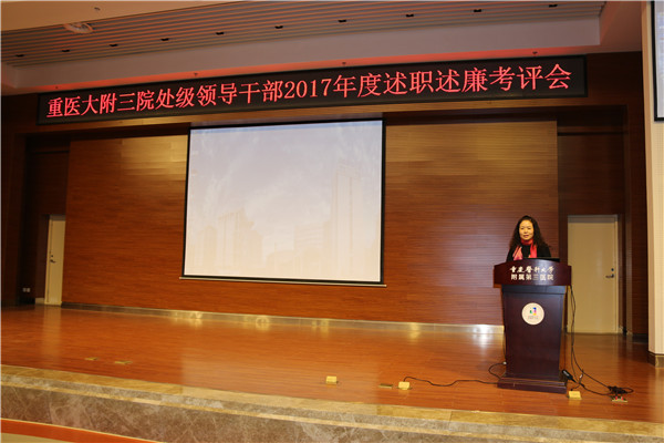 2018-01-31 00:00 按照校党委和组织部的统一部署,我院2018年1月29日下午在学术报告厅召开了2017年度重医大附三院处级领导干部考核会议。参会人员包括院领导、全院中层干部、支部书记、支部委员、民主党派人士、具有高级职称的教职工代表和普通教职员工代表共100余人。会议由党委副书记、副院长曾燕主持。重庆医科大学党委副书记冯跃林,校党委组织部部长刘建瑛莅临指导。