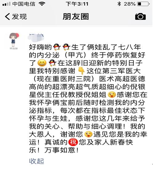 2019年农历猪年到来之际,江女士再次复查,所有指标符合停药标准。当倪教授将甲亢治愈、可以停药的消息告诉江女士时,其欣喜之情溢于言表,立即发出前面提到的微信朋友圈。