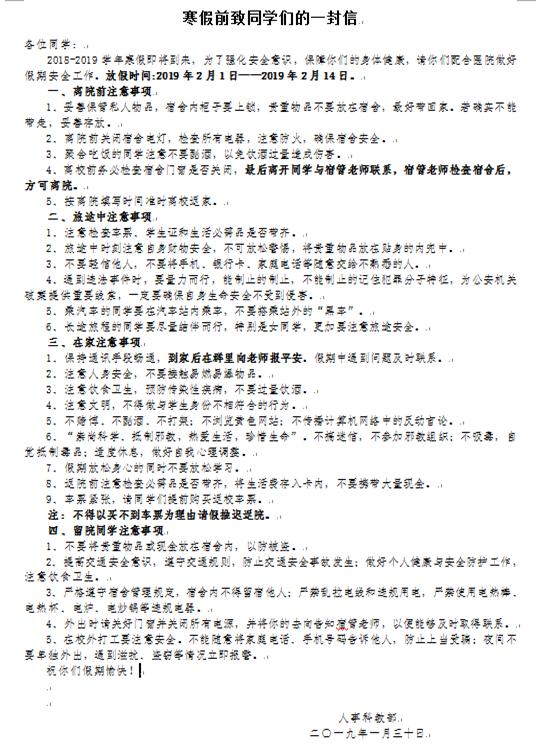 根据学校安稳工作统一部署,我院认真贯彻执行“安全第一,预防为主”的安全工作方针,落实“谁主管、谁负责”和逐级安全责任制,高度重视寒假期间学生安稳工作,抓重点,注防范,加强安全管理,确保学生人身和财产安全。