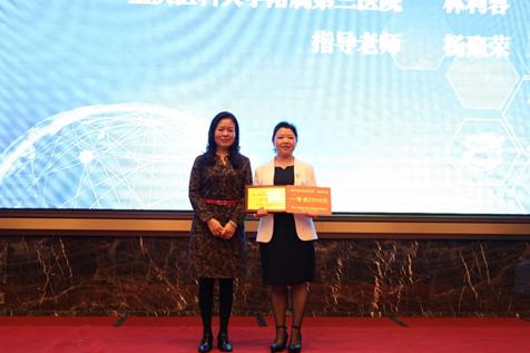 重医大附三院党委副书记、副院长曾燕教授为一等奖获得者林利容医生颁发荣誉证书