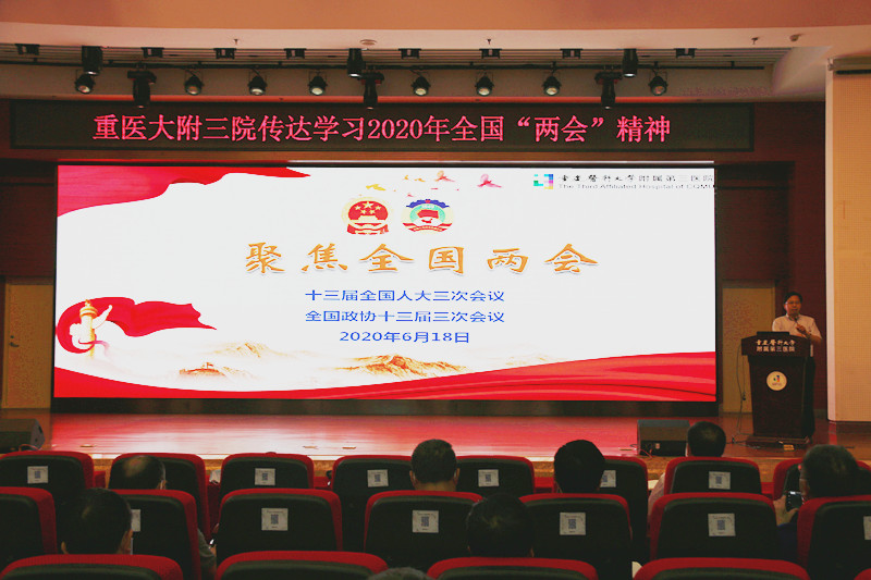 2020-06-19 00:00 6月18日下午,重医大附三院院长傅仲学在学术报告厅专题传达2020年全国“两会”精神,并结合5月30日重庆市领导干部大会精神与市委书记陈敏尔在会上的重要讲话精神,对学习好、宣传好、贯彻好2020年全国“两会”精神和习近平总书记两会期间重要讲话精神进行安排部署。院领导班子成员和全院中层干部,各党支部书记、委员等共计100余人参加了学习。