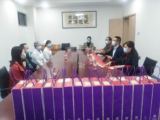 因正值医院医疗业务工作高峰时段,多数专家都在门诊、病房和手术等工作岗位上忙碌,慰问组一行就在医院第一会议室,对过生日的专家代表超声科李锐主任和员工代表中心ICU陈雨护士长、急救部吴菲助理护士长进行了慰问,并简短座谈交流。我院党委副书记、副院长曾燕代表医院对童书记、李主席和黄主席的到来表示欢迎,对渝北区科协一直以来重视科技人才、关心科技人才表示感谢。并介绍了医院发展历程、医疗技术水平、学科人才尤其是医院科技工作者和科研成果情况,以及我院首批市级援鄂医疗队队员的突出事迹。