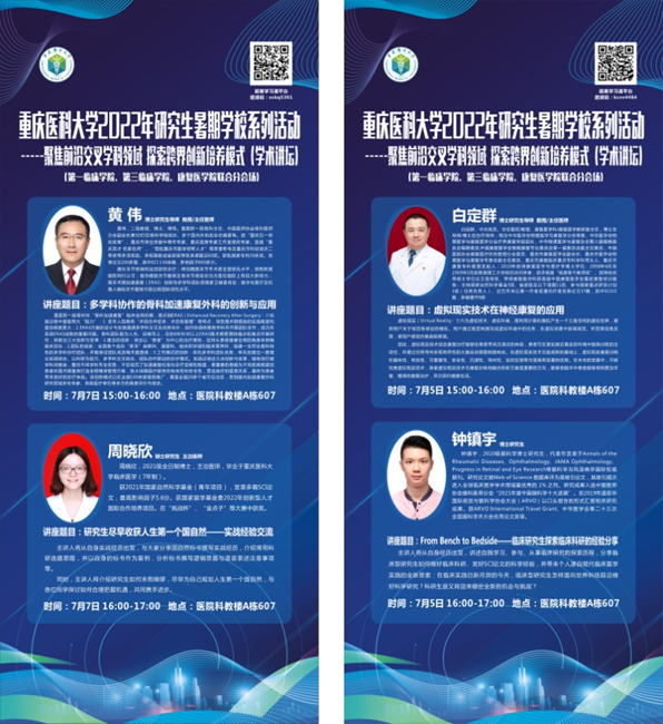 2022-07-12 00:00 为响应重庆医科大学2022年研究生暑期学校活动号召,积极推进校内多学科交叉发展,联动校内各院系紧密合作,提供研究生科研学术交流平台,7月5日、7日,重庆医科大学第一临床学院、第三临床学院、康复医学院联合主办了“聚焦前沿交叉学科领域、探索跨界创新培养模式”暑期学校系列学术论坛活动。