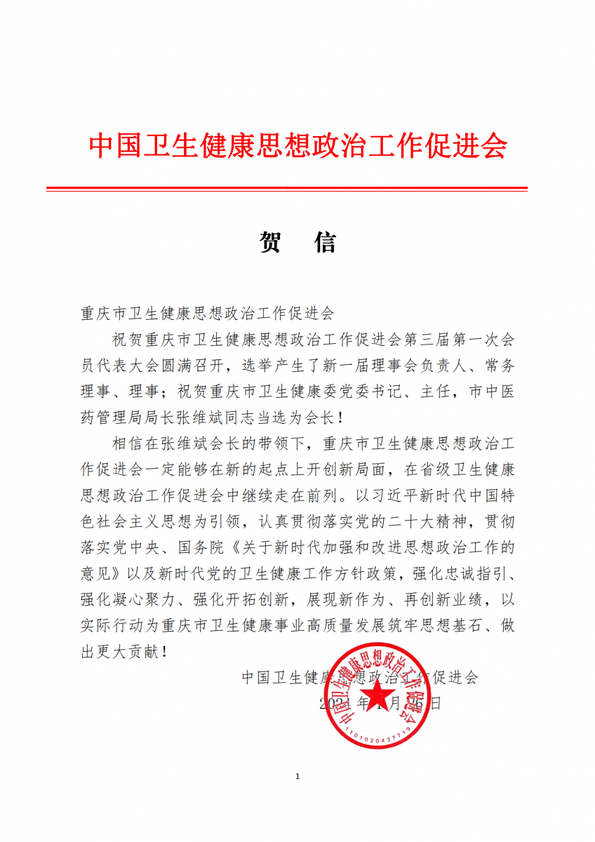我院受邀担任重庆市卫生健康思想政治工作促进会第三届理事会副会长单位,院党委书记刘志远同志作为重庆市卫生健康思想政治工作促进会第三届理事会副会长候选人代表参会。