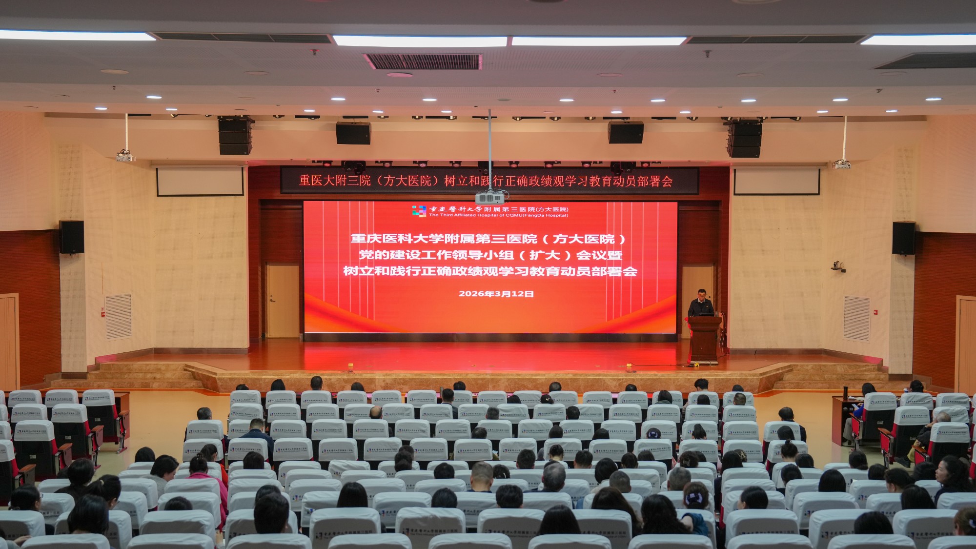 2026-03-13 22:292026年3月12日,重医大附三院(方大医院)党委在学术报告厅召开党的建设工作领导小组(扩大)会议,深入学习贯彻习近平总书记关于树立和践行正确政绩观的重要论述,传达学习中央、市委和两江新区卫健委有关会议精神,研究部署关于医院开展树立和践行正确政绩观学习教育的工作安排,动员部署学习教育工作。党委书记李为兵主持会议并讲话,院领导、各党支部书记及全体中层及以上干部参加会议。