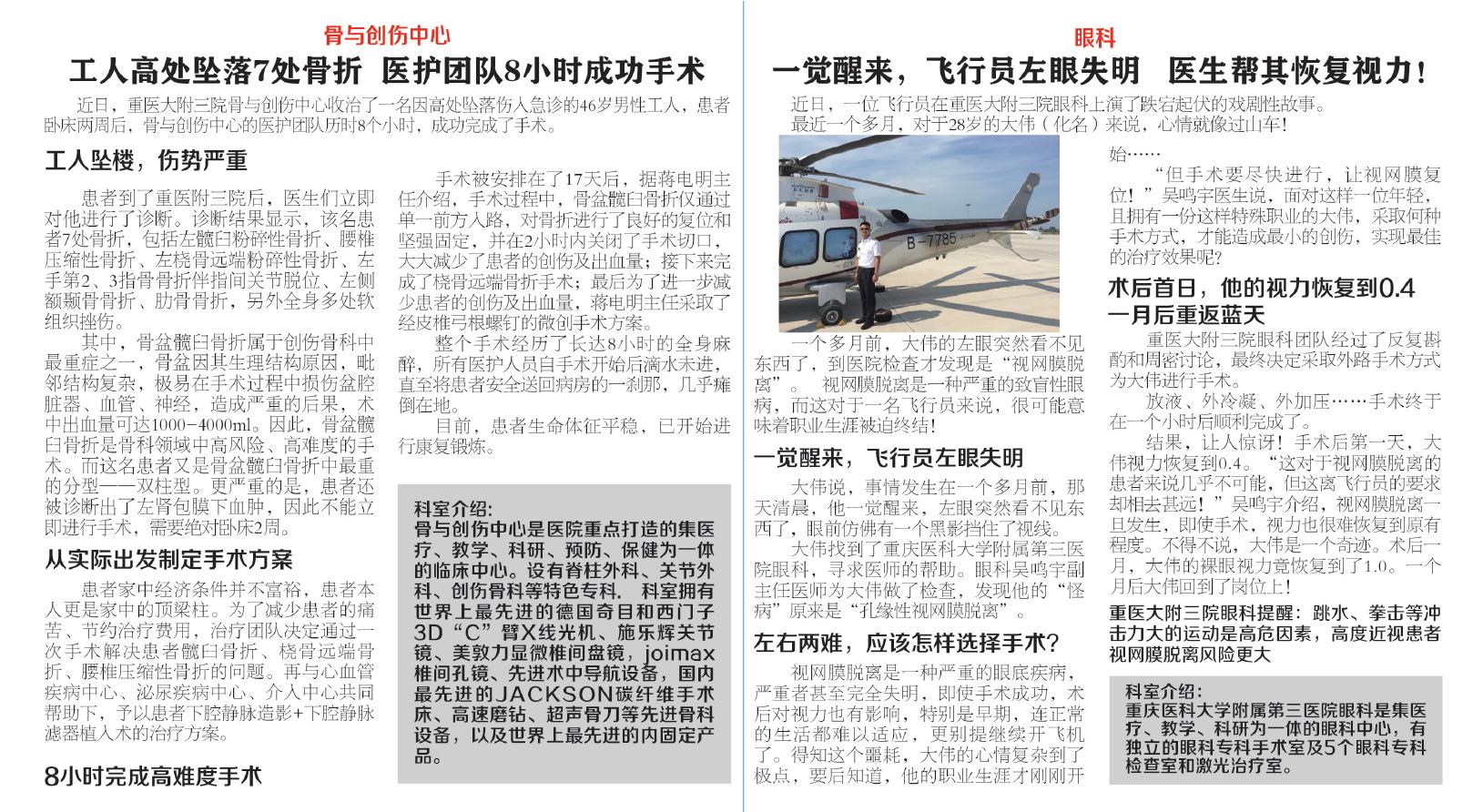 【重庆商报】工人高处坠落7处骨折 医护团队8小时成功手术&一觉醒来,飞行员左眼失明 医生帮其恢复视力!