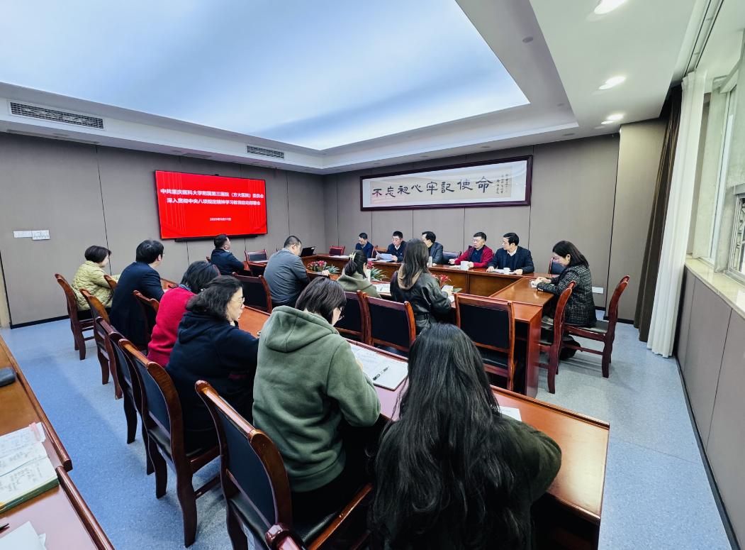 会议传达学习了中共中央办公厅印发的《关于在全党开展深入贯彻中央八项规定精神学习教育的通知》、中央党的建设工作领导小组会议精神、市委常委会会议精神,解读了《中共重庆医科大学附属第三医院(方大医院)委员会深入贯彻中央八项规定精神学习教育的实施方案》,明确总体要求、工作安排和任务分工。