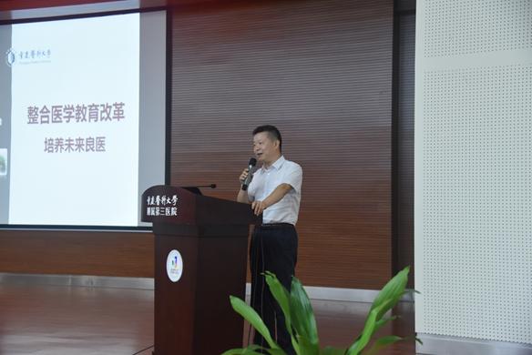 邓校长对附三院开业一年来取得的成绩给予高度赞扬,就我院对教学工作的重视给予充分肯定。随后,邓校长作《整合医学教育改革》的专题培训,他指出整合医学是另一种医学的智慧,培训围绕整合医学提出的背景、整合医学教育改革的“三大问题、一大支撑”(基层学术组织改革、“以器官系统为基础”的课程体系整合、教材编写及信息支撑)以及我校整合医学发展现状展开。邓校长讲到附三院“以人为本”、“以患者为中心”的中心制诊疗模式打破了内外科联系不紧密的局面,实现了多学科融合发展,与我校整合医学改革高度契合。