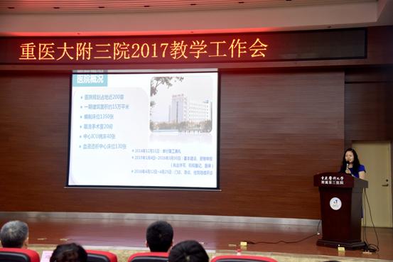 6月20日下午,“重医大附三院2017年教学工作会”在学术报告厅隆重召开。本次会议由党委副书记、副院长曾燕主持,特邀重庆医科大学副校长邓世雄、教务处副处长李兵出席并作专题培训,院常务副院长严敏、人力资源部赵臻晶科长、教学督导组成员、教学课程组组长及全院300余名带教教师参会。