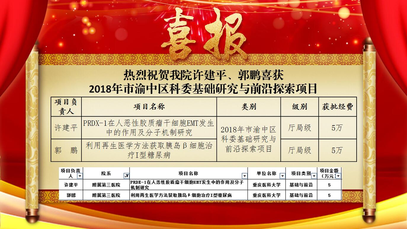祝贺我院许建平、郭鹏喜获2018年市渝中区科委基础研究与前沿探索项目