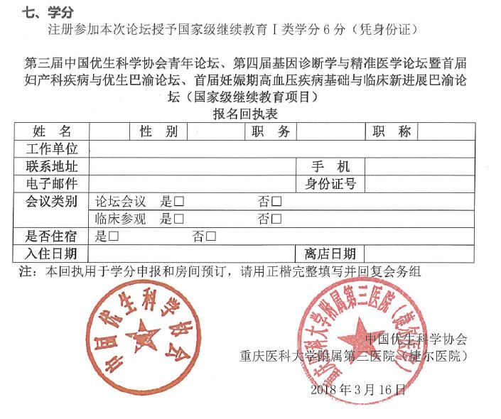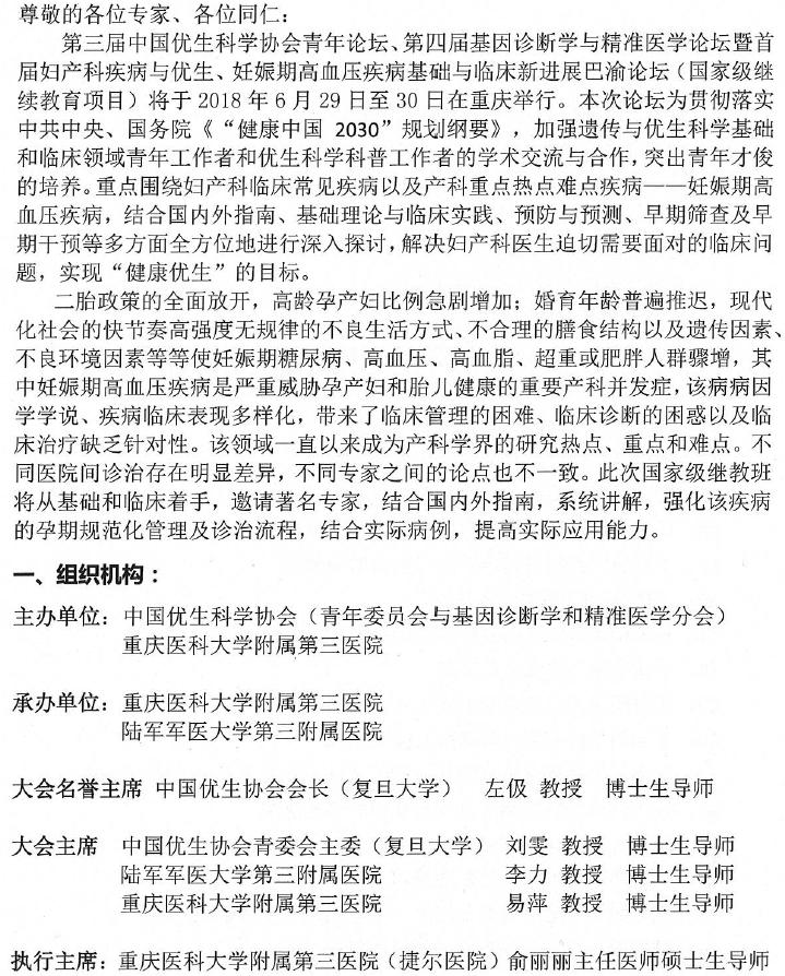 【学术会议】第三届中国优生科学协会青年论坛第四届基因诊断学和精准医学论坛暨首届妇产科疾病与优生、妊娠期高血压疾病基础与临床新进展巴渝论坛(国家级继续教育项目)