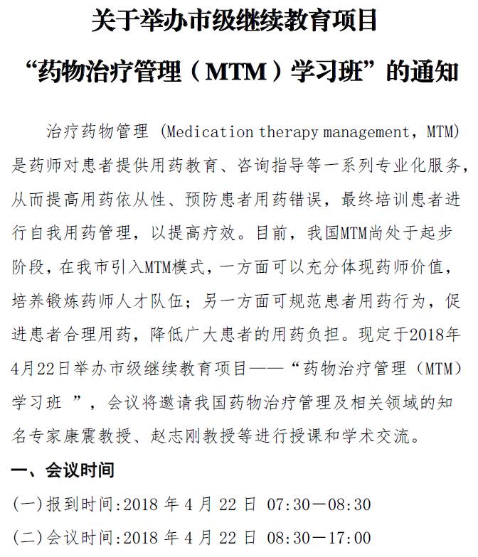 【学术会议】关于举办市级继续教育项目“药物治疗管理( MTM)学习班“的通知”