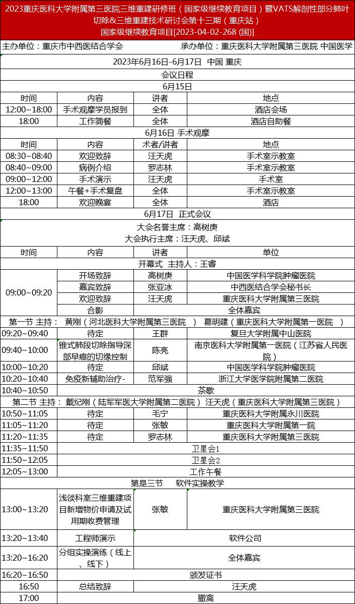 由重庆市中西医结合学会主办,重庆市中西医结合学会肺结节精准治疗专业委员会、重庆医科大学附属第三医院与中国医学科学院肿瘤医院联合承办的,“2023重庆市中西医结合学会肺结节精准治疗专业委员会年会暨国家级继教项目【项目编号2023-04-02-268 (国)】:解剖性部分肺叶切除&三维重建技术研讨班第十三期(重庆站)”将于2023年6月16~17日在重庆银鑫世纪酒店举办。